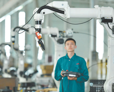河北省任丘市通過搭建科技創(chuàng)新平臺,建設研發(fā)中心、技術研究院,持續(xù)深化產學研合作交流,推動企業(yè)轉型升級。圖為工作人員在生產車間調試機器人。 |