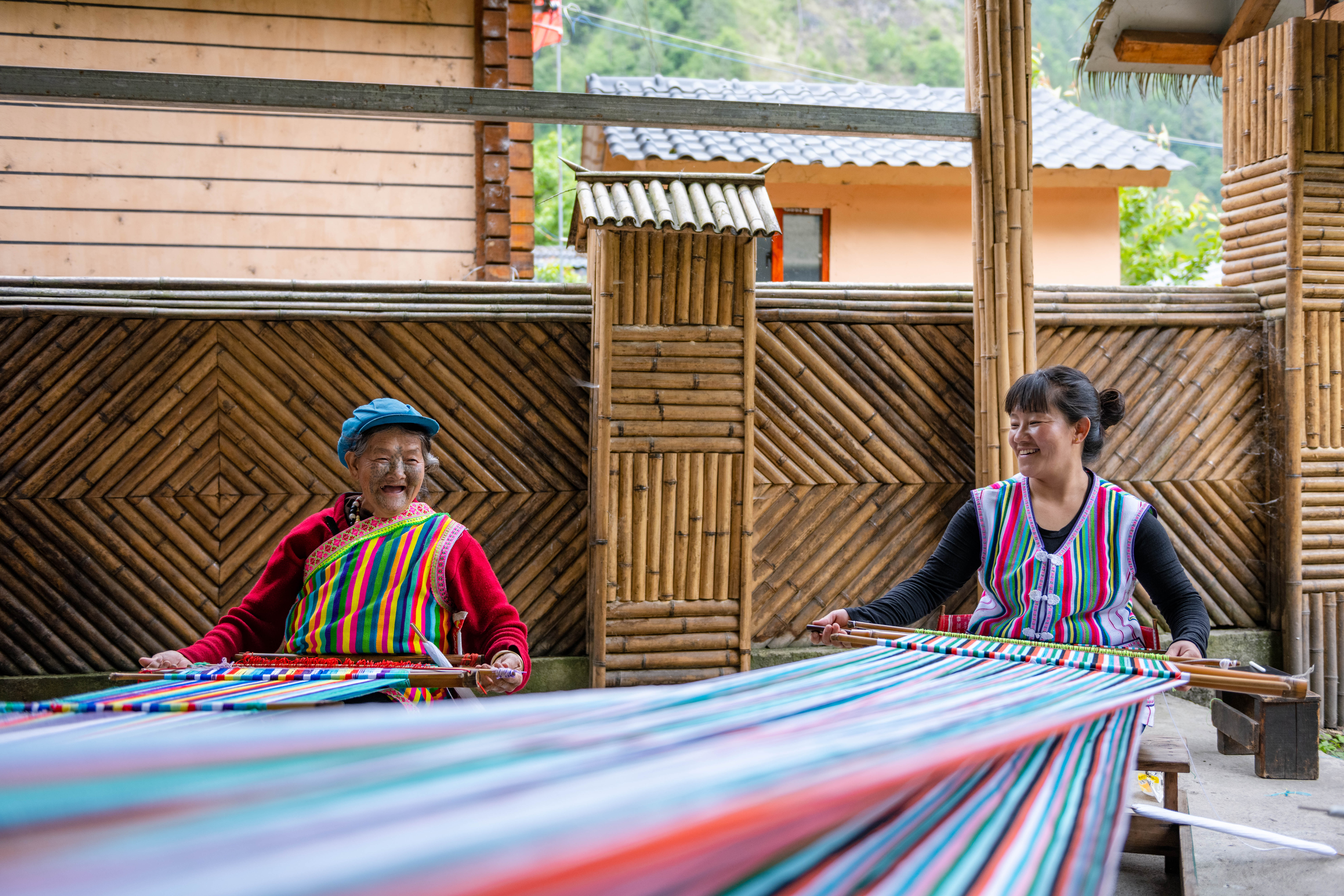 在云南省貢山獨(dú)龍族怒族自治縣獨(dú)龍江鄉(xiāng)迪政當(dāng)村,獨(dú)龍族老人李文仕(左)和女兒在編織獨(dú)龍?zhí)海?022年5月10日攝)。新華社記者 曹夢(mèng)瑤 攝