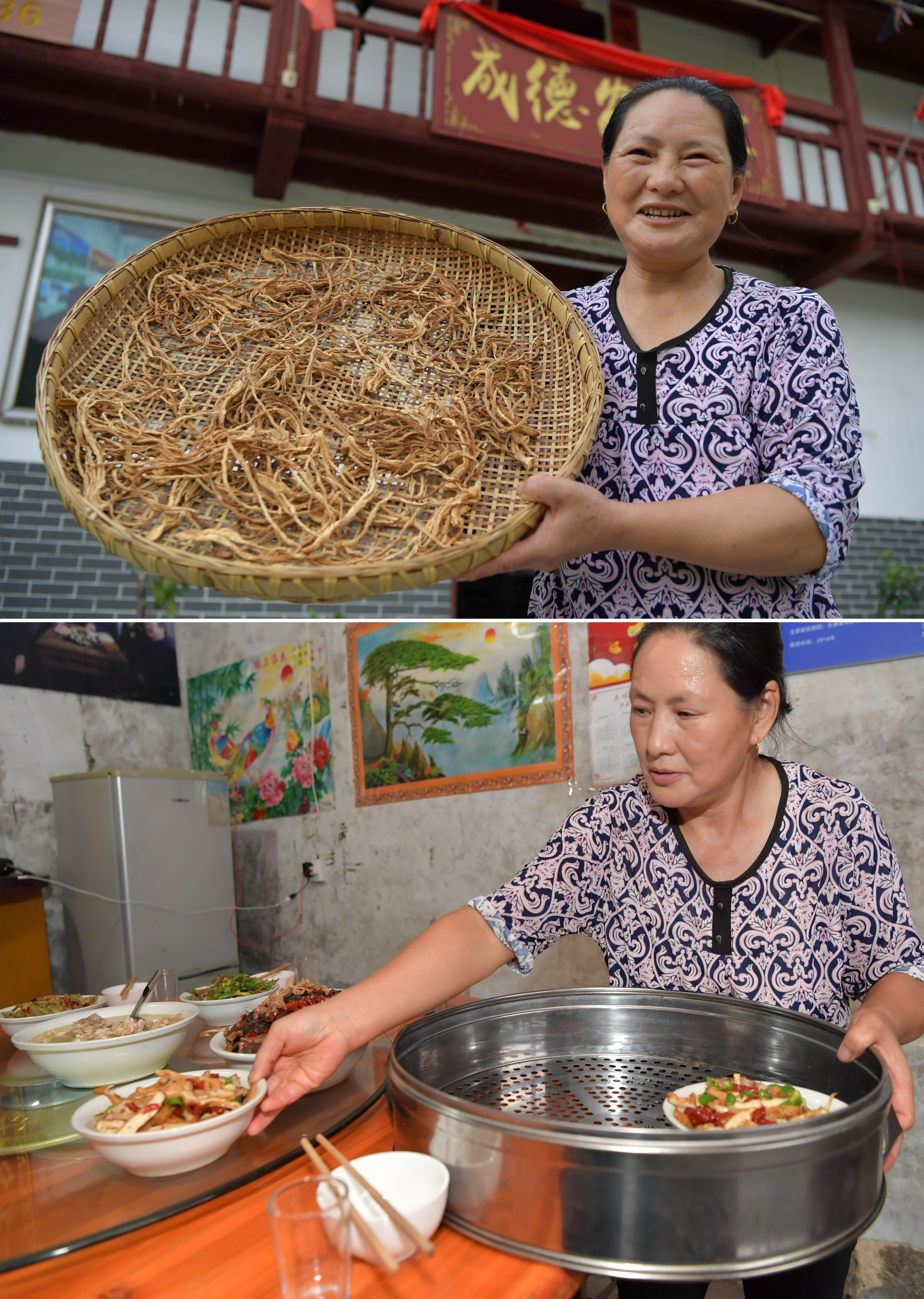 拼版照片:上圖為江西省井岡山市神山村村民彭夏英在自己開辦的農(nóng)家樂(lè)內(nèi)展示她家自制的當(dāng)?shù)靥禺a(chǎn);下圖為彭夏英在農(nóng)家樂(lè)內(nèi)給顧客上菜(2020年7月15日攝)。新華社記者 彭昭之 攝