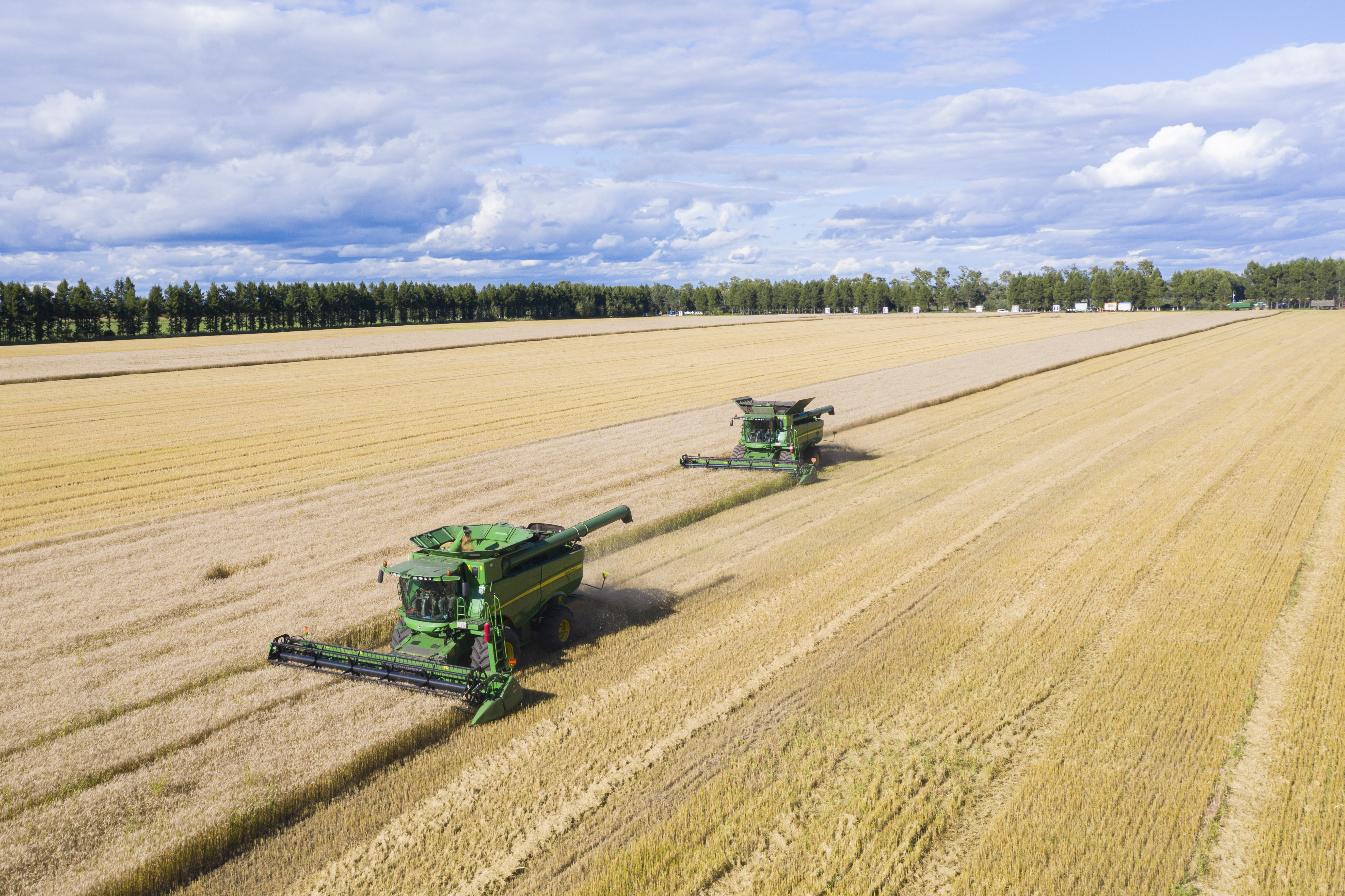 聯(lián)合收割機(jī)在黑龍江北大荒集團(tuán)紅星農(nóng)場(chǎng)有限公司田間收獲小麥(2022年8月10日攝,無(wú)人機(jī)照片)。新華社記者 謝劍飛 攝