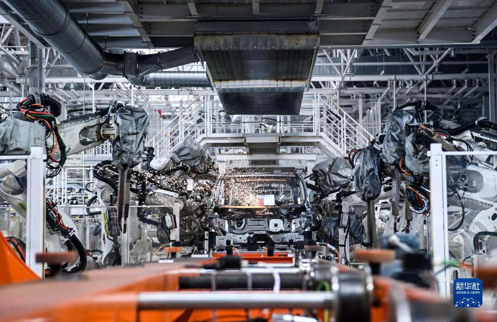 10月17日,在吉林長春中國第一汽車集團有限公司紅旗繁榮工廠焊裝車間內,焊裝機器人在生產線上焊接車身。新華社記者 顏麟蘊 攝