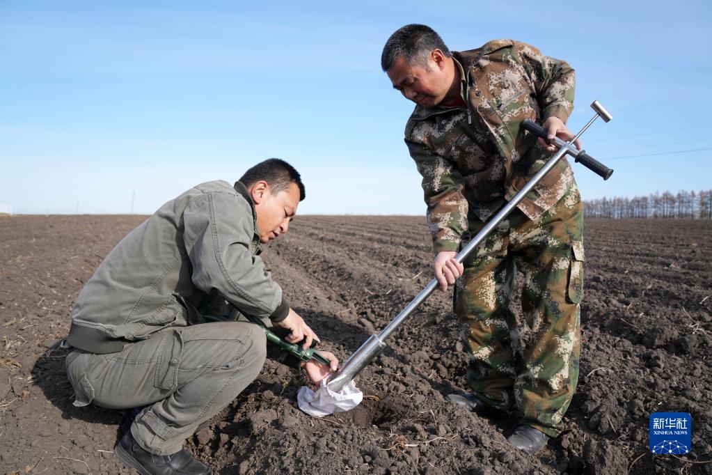 10月20日,北大荒農(nóng)墾集團(tuán)有限公司北安分公司趙光農(nóng)場有限公司技術(shù)人員在取土樣。新華社記者 王建威 攝