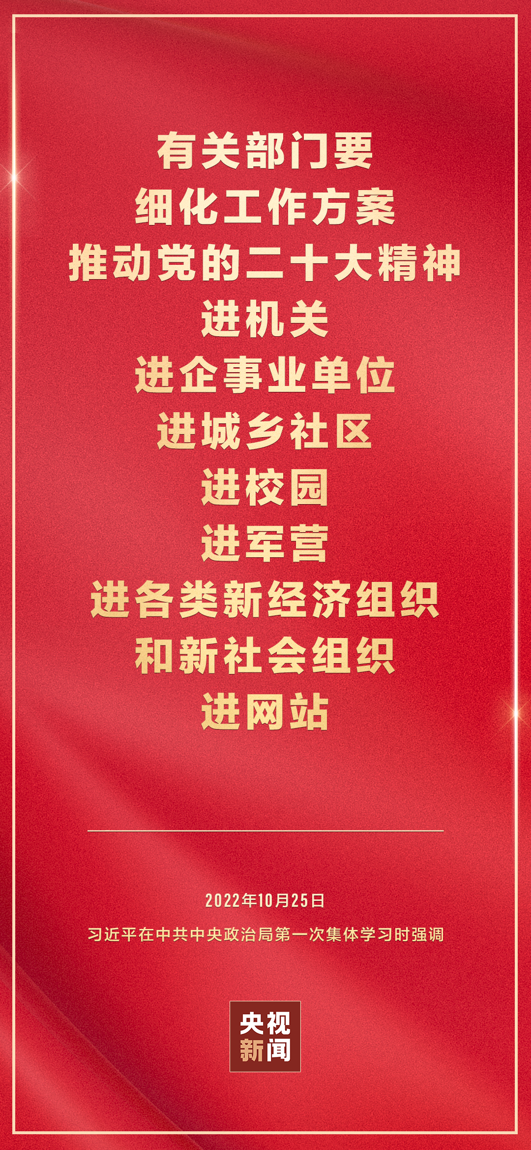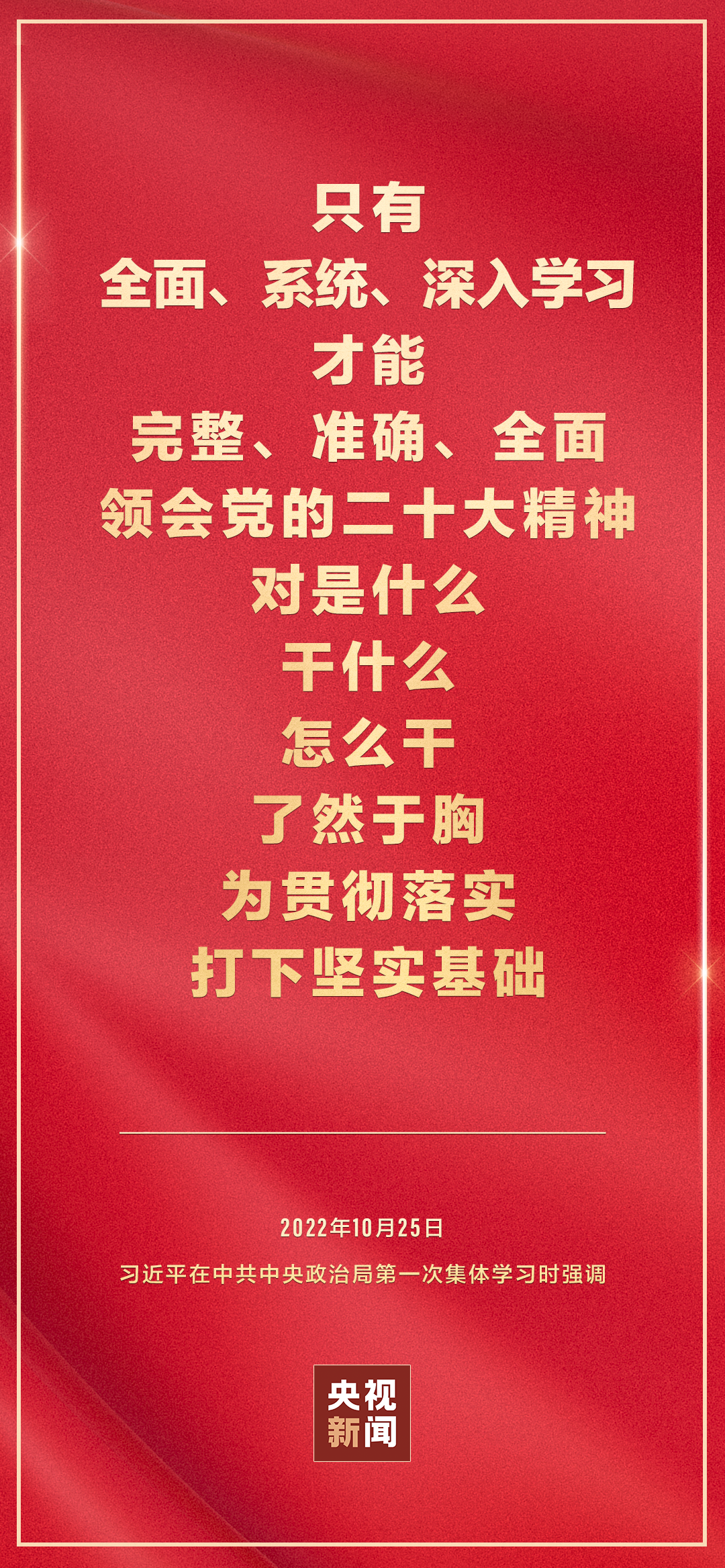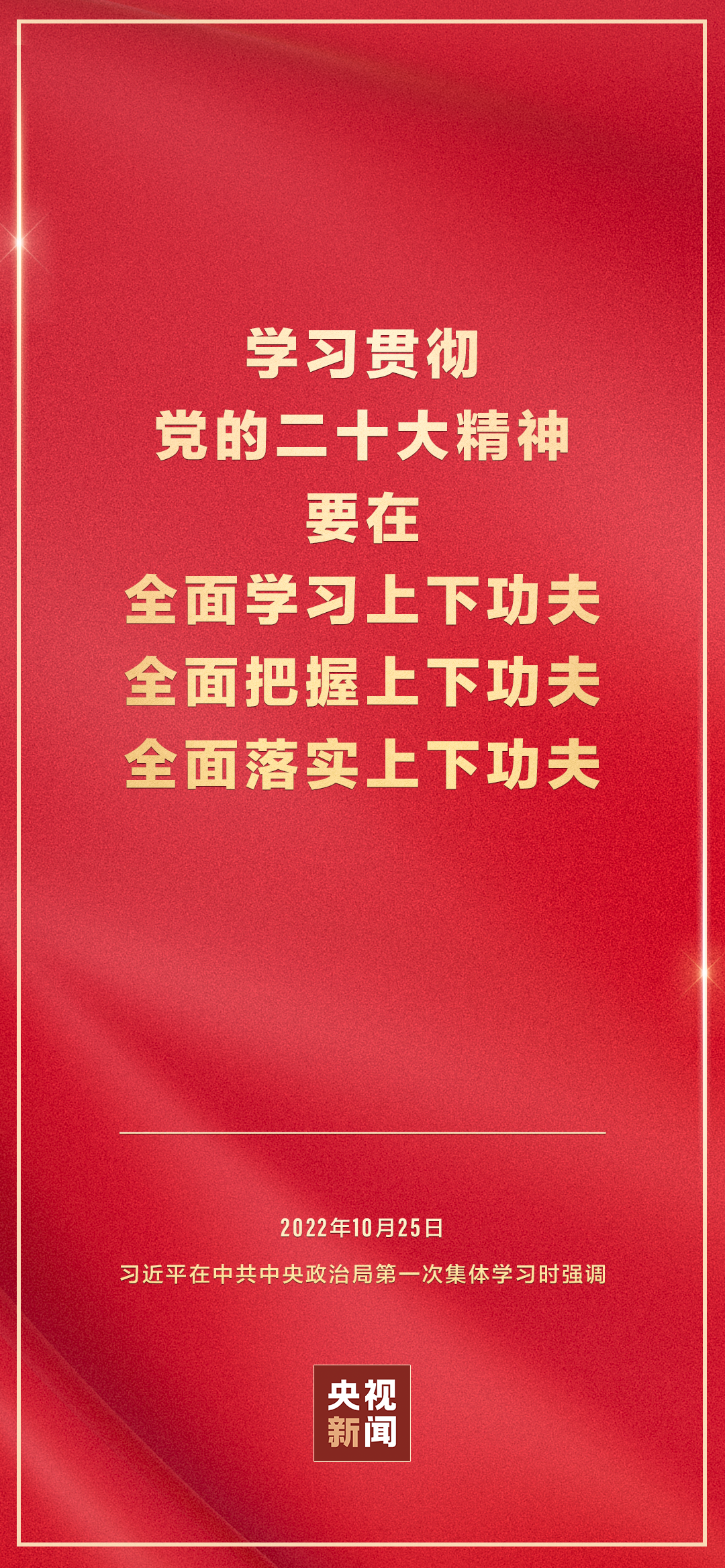 二十屆中共中央政治局10月25日下午就學(xué)習(xí)貫徹黨的二十大精神進(jìn)行第一次集體學(xué)習(xí)。中共中央總書記習(xí)近平在主持學(xué)習(xí)時強(qiáng)調(diào),全黨要在全面學(xué)習(xí)、全面把握、全面落實上下功夫,堅定不移把黨的二十大提出的目標(biāo)任務(wù)落到實處,奮力奪取全面建設(shè)社會主義現(xiàn)代化國家新勝利。