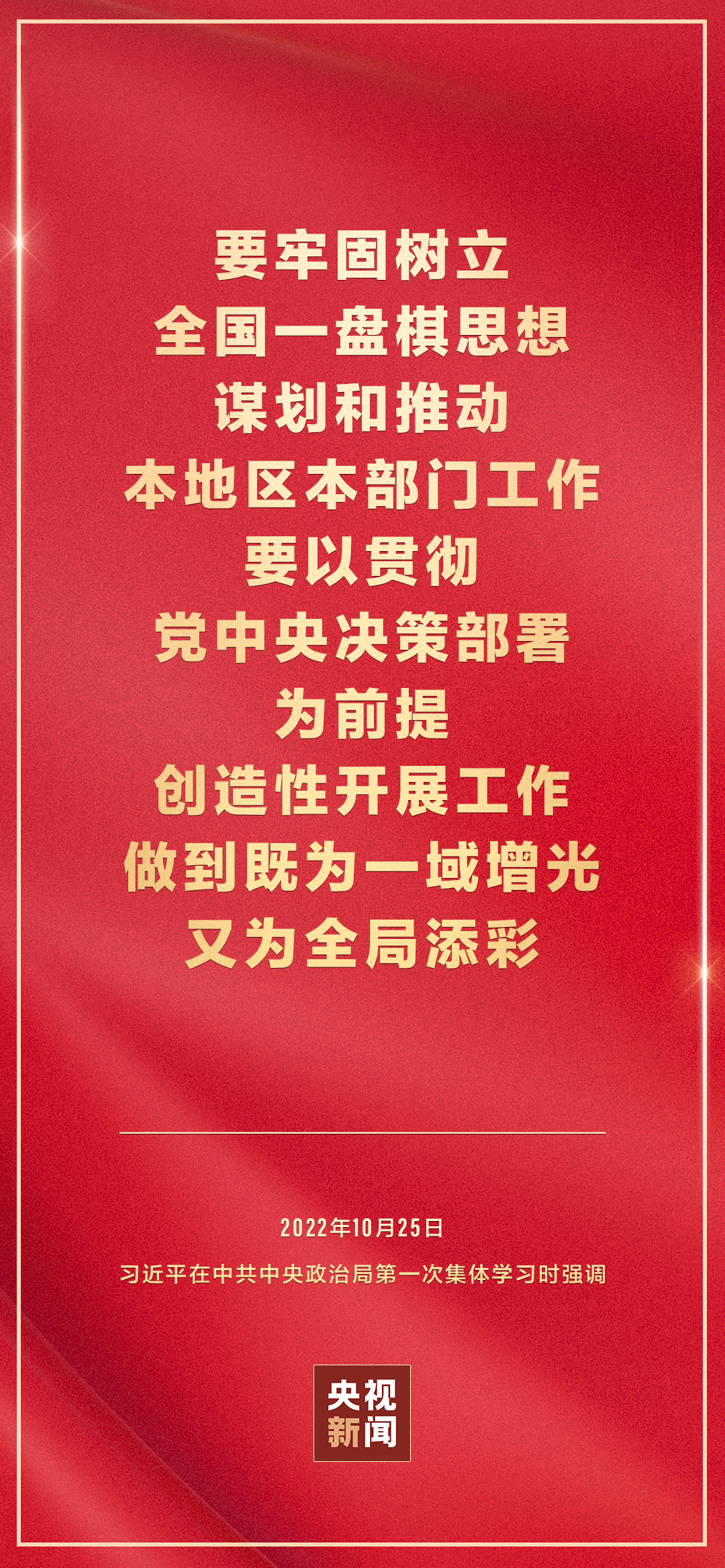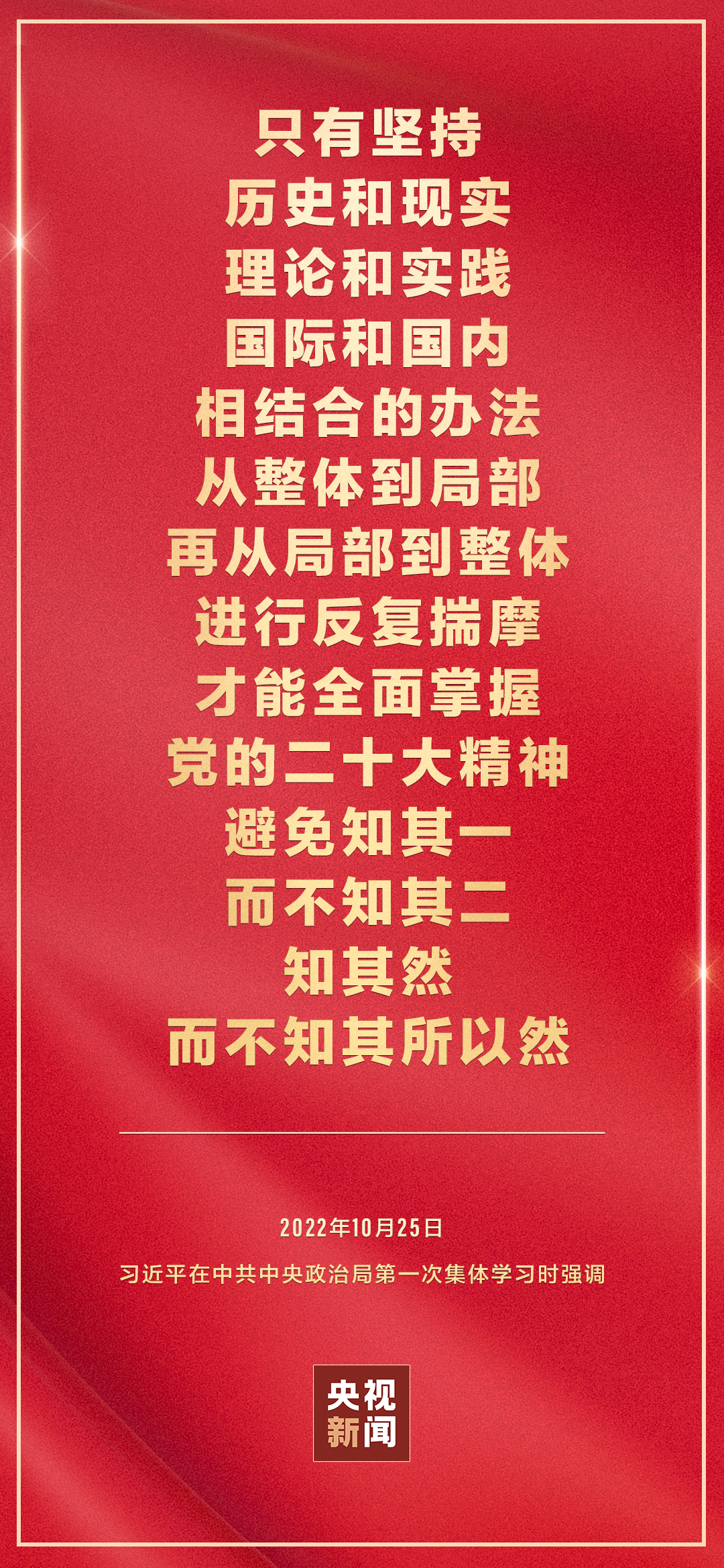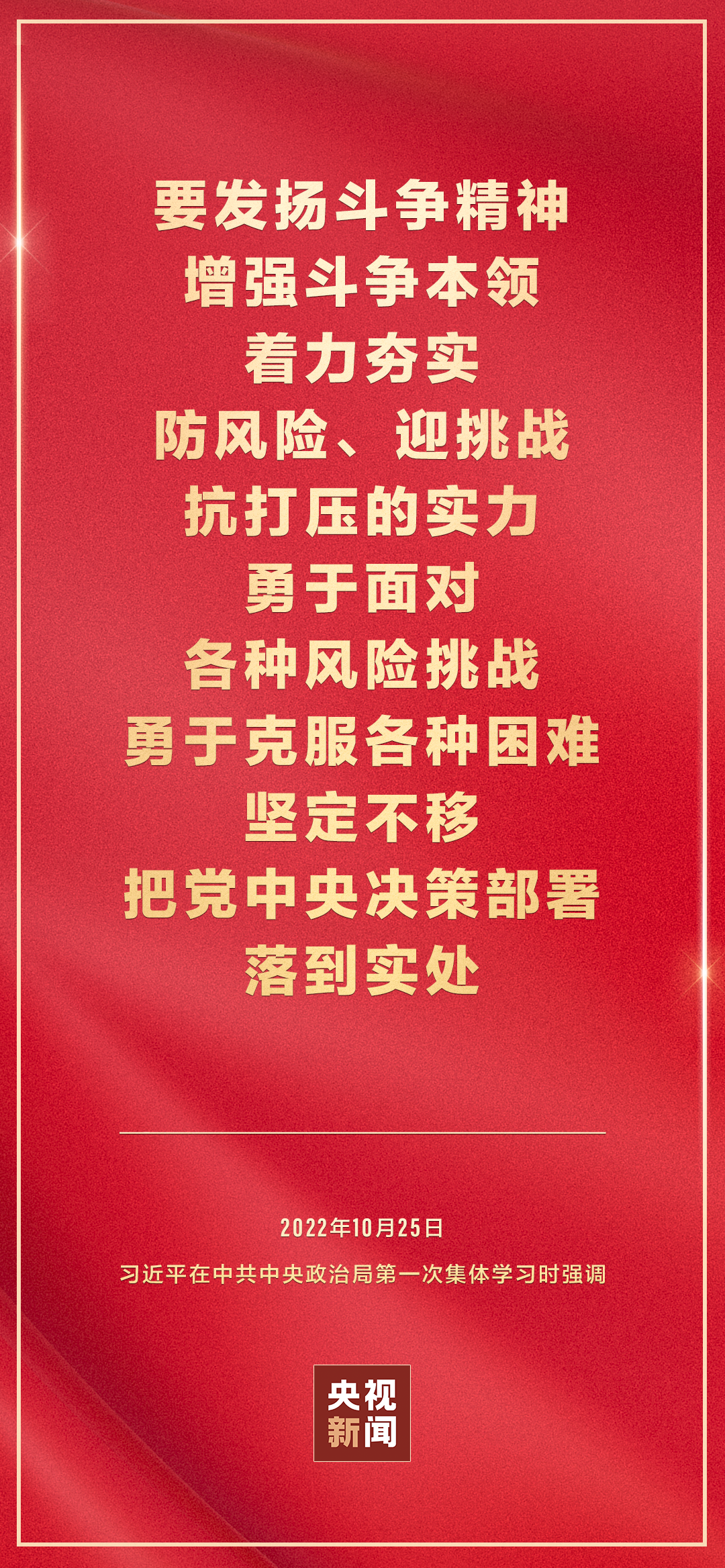 二十屆中共中央政治局10月25日下午就學(xué)習(xí)貫徹黨的二十大精神進(jìn)行第一次集體學(xué)習(xí)。中共中央總書記習(xí)近平在主持學(xué)習(xí)時強(qiáng)調(diào),全黨要在全面學(xué)習(xí)、全面把握、全面落實上下功夫,堅定不移把黨的二十大提出的目標(biāo)任務(wù)落到實處,奮力奪取全面建設(shè)社會主義現(xiàn)代化國家新勝利。