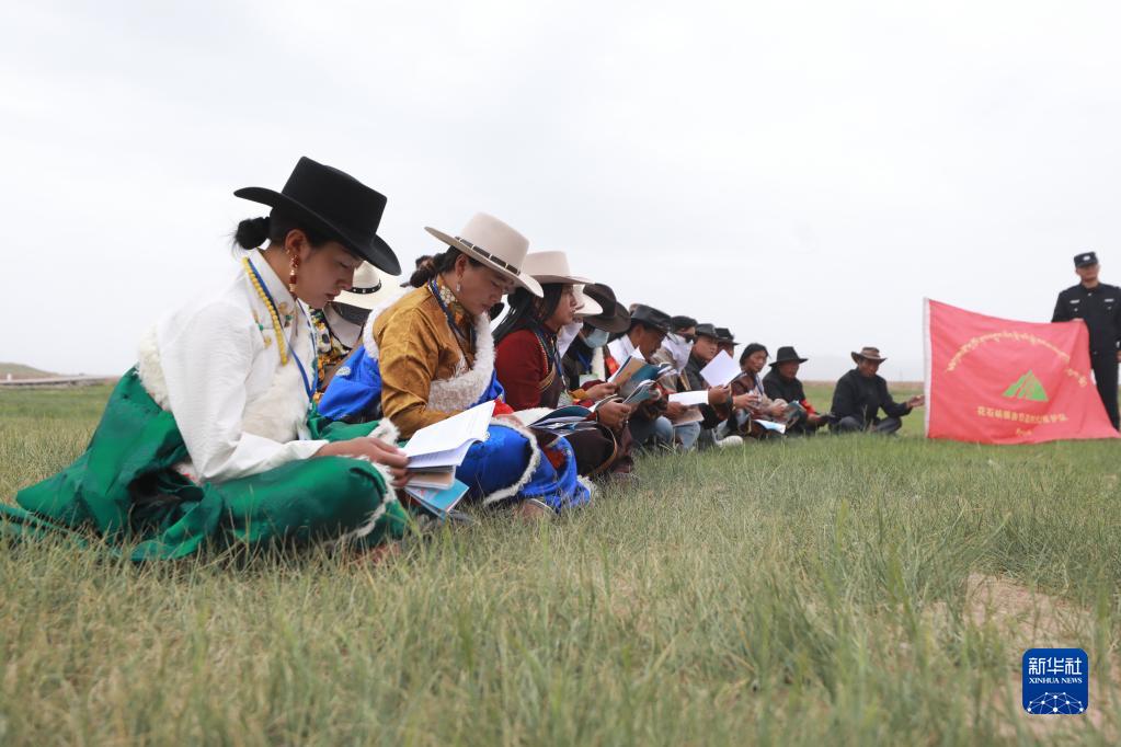 2022年7月12日,在瑪多縣冬格措納湖畔,當(dāng)?shù)啬撩袢罕娫诼牞敹嗫h人民法院巡回法庭法律宣講。新華社發(fā)