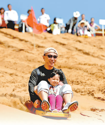 沙坡頭旅游景區(qū),游客在體驗(yàn)滑沙項(xiàng)目。 |