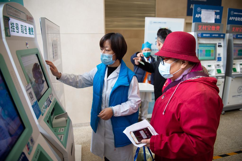 2020年12月9日,在首都醫(yī)科大學(xué)附屬北京天壇醫(yī)院,工作人員在幫助老年人使用自助機查詢號源。新華社記者 陳鐘昊 攝