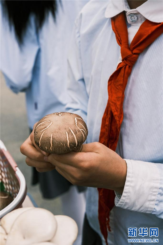 操場(chǎng)上,孩子們擺起了野生菌集市