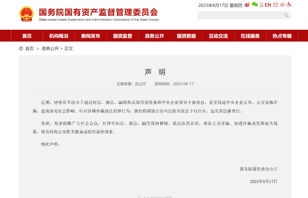 國務(wù)院國資委辦公廳8月17日在國務(wù)院國資委官網(wǎng)發(fā)布聲明稱,近期,持續(xù)有不法分子通過短信、微信、QQ等形式冒用國務(wù)院國資委和中央企業(yè)領(lǐng)導(dǎo)干部身份,甚至偽造中央企業(yè)公章、公文實施詐騙,造成惡劣社會影響。針對涉嫌詐騙違法犯罪行為,國務(wù)院國資委將商請公安司法機(jī)關(guān)依法予以打擊,追究其法律責(zé)任。
