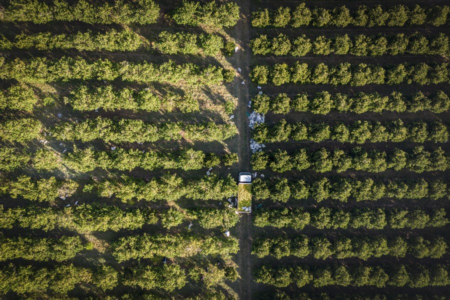 這是2023年5月24日在南非西北省拍攝的一處柑橘農場(無人機照片)。(新華社發(fā),希拉茲·穆罕默德攝)