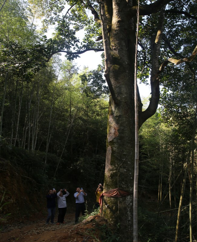 若非親眼所見,簡(jiǎn)直難以置信,眼前是一棵三個(gè)成年男子都難以環(huán)抱的含笑,一棵常被用來(lái)點(diǎn)綴的綠化樹,竟長(zhǎng)成二三十米高的參天大樹,它長(zhǎng)出了人們的經(jīng)驗(yàn)范疇,讓人一下失去贊美的語(yǔ)言。這么高大的含笑不要說(shuō)是全縣,就是全市、全省甚至全國(guó)也為之罕見。巧的是,這棵參天大含笑,又恰好長(zhǎng)在必經(jīng)之地的古道山蔭處,自然為世人所銘記。