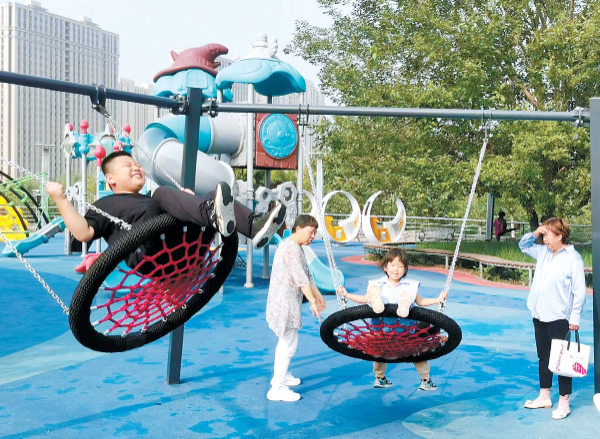 初秋,在亦莊涼水河公園,孩子們暢玩輪胎秋千。近年來,本市不少公園經(jīng)過改造提升,新增了滑索、繩網(wǎng)等新設施,變得更加“兒童友好”。 記者 甘南攝