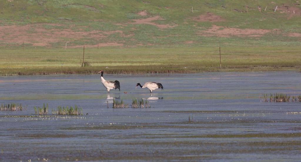 2022年7月1日,在河南縣境內(nèi)活動(dòng)的黑頸鶴。(才項(xiàng)南加 攝)