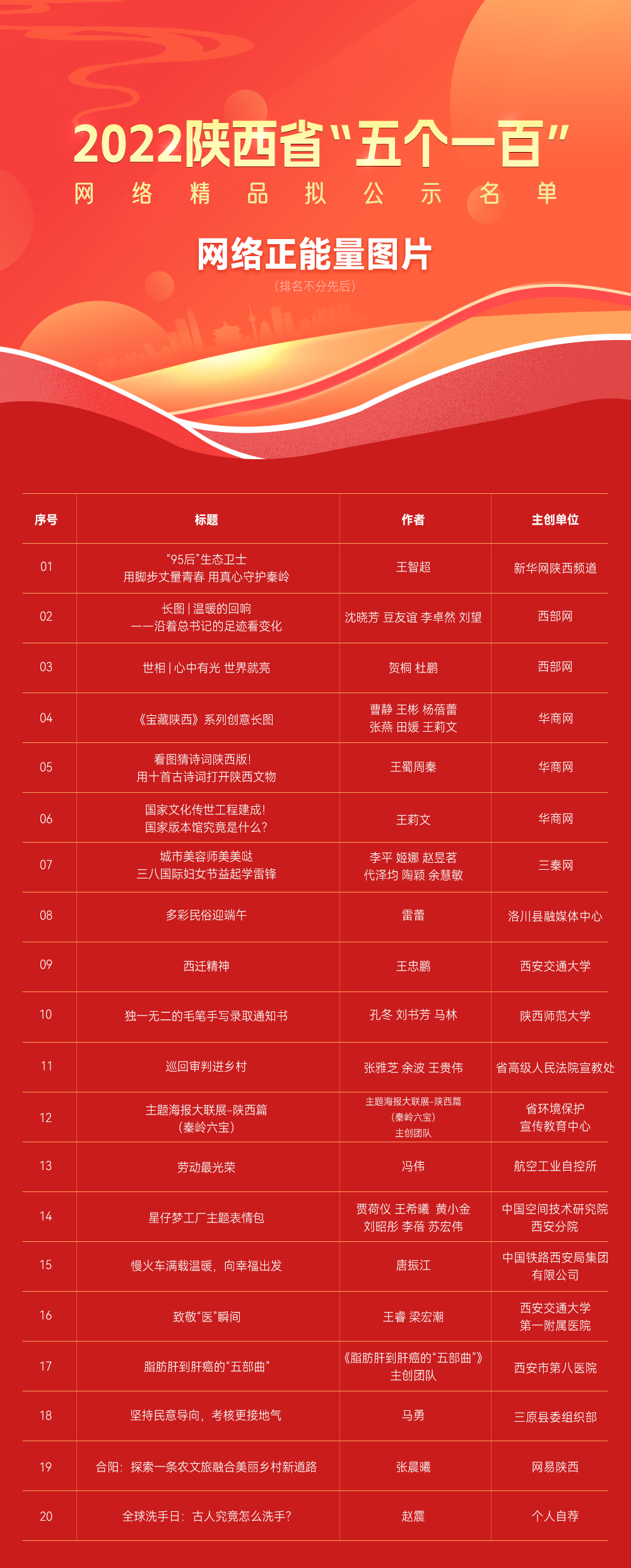 近日,記者從陜西省委網(wǎng)信辦獲悉:2022陜西省“五個(gè)一百”網(wǎng)絡(luò)精品終選結(jié)果出爐,共100件網(wǎng)絡(luò)正能量作品脫穎而出。具體名單如下:
