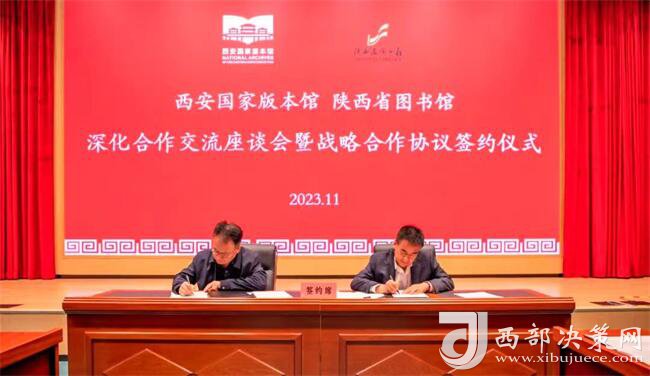 西部決策網(wǎng)訊 11月1日,西安國(guó)家版本館、陜西省圖書(shū)館舉行深化合作交流座談會(huì)暨戰(zhàn)略合作協(xié)議簽約儀式。西安國(guó)家版本館黨委書(shū)記、館長(zhǎng)白光亮,陜西省圖書(shū)館黨委書(shū)記、館長(zhǎng)周云岳分別致辭并代表兩館在戰(zhàn)略合作協(xié)議上簽字,兩館有關(guān)負(fù)責(zé)同志分別作了交流發(fā)言。