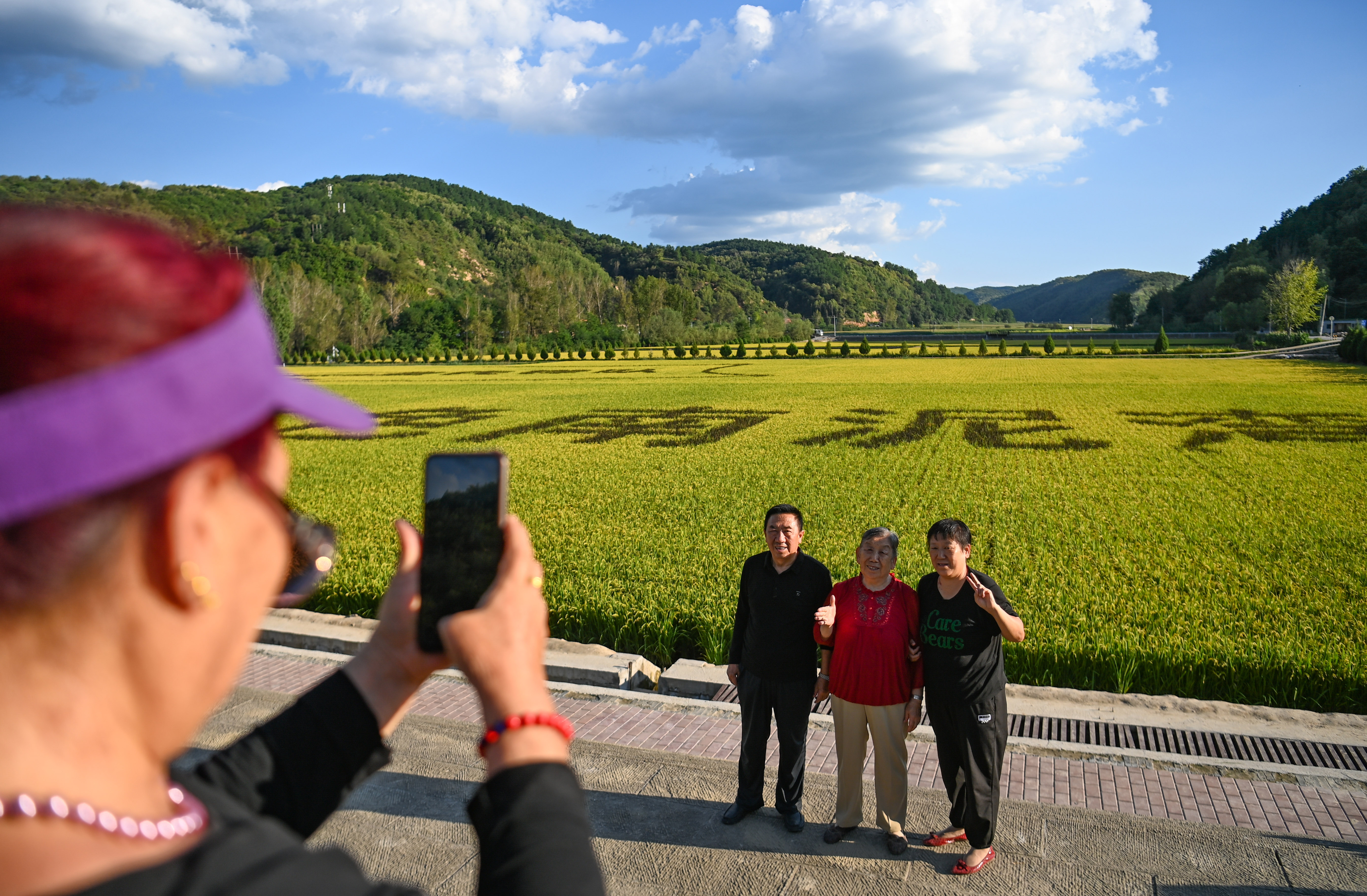 8月29日,游客在陜西延安南泥灣國(guó)家濕地公園的稻田前留影。新華社記者 鄒競(jìng)一 攝