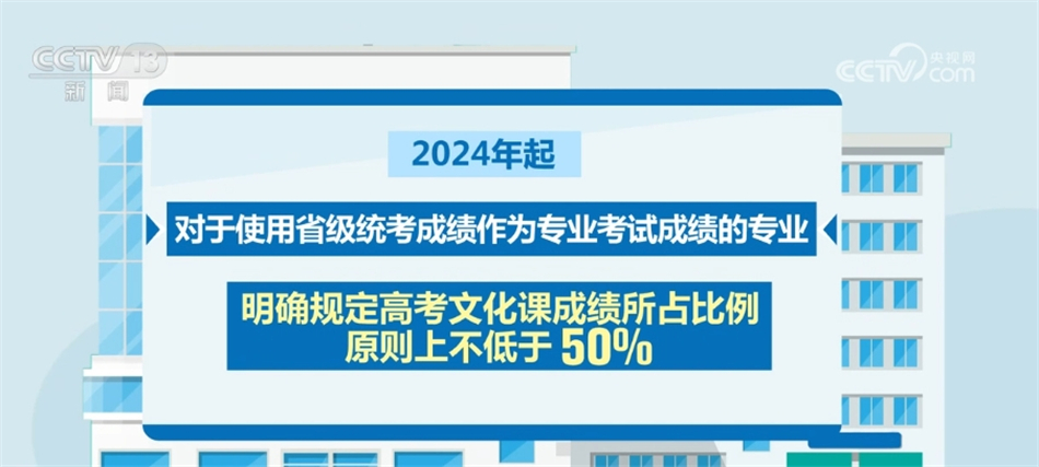 此外,2024年起,對于使用省級統(tǒng)考成績作為專業(yè)考試成績的專業(yè),明確規(guī)定高考文化課成績所占比例原則上不低于50%。同時,鼓勵校考高校結(jié)合專業(yè)培養(yǎng)要求,進(jìn)一步提高考生高考文化課成績錄取要求。