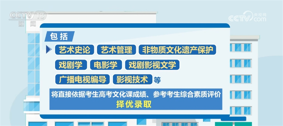 據(jù)了解,藝術(shù)類專業(yè)依據(jù)考生高考文化成績、專業(yè)考試成績,參考綜合素質(zhì)評價進(jìn)行招生錄取。此次藝考改革一個重要的變化是,部分藝術(shù)類專業(yè)不再組織專業(yè)考試,包括藝術(shù)史論、藝術(shù)管理、非物質(zhì)文化遺產(chǎn)保護(hù)、戲劇學(xué)、電影學(xué)、戲劇影視文學(xué)、廣播電視編導(dǎo)、影視技術(shù)等,將直接依據(jù)考生高考文化課成績、參考考生綜合素質(zhì)評價,擇優(yōu)錄取。