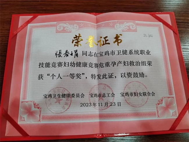 鳳翔區(qū)醫(yī)院產(chǎn)科醫(yī)生張春娟代表鳳翔區(qū)衛(wèi)健系統(tǒng)參加危重孕產(chǎn)婦救治、危重新生兒救治等項目競賽。在比賽中,張春娟沉著發(fā)揮,認真應(yīng)對,憑借扎實的理論基礎(chǔ)、嫻熟的操作技能,最終榮獲危重孕產(chǎn)婦救治個人一等獎、危重孕產(chǎn)婦救治技能操作單項獎等殊榮。