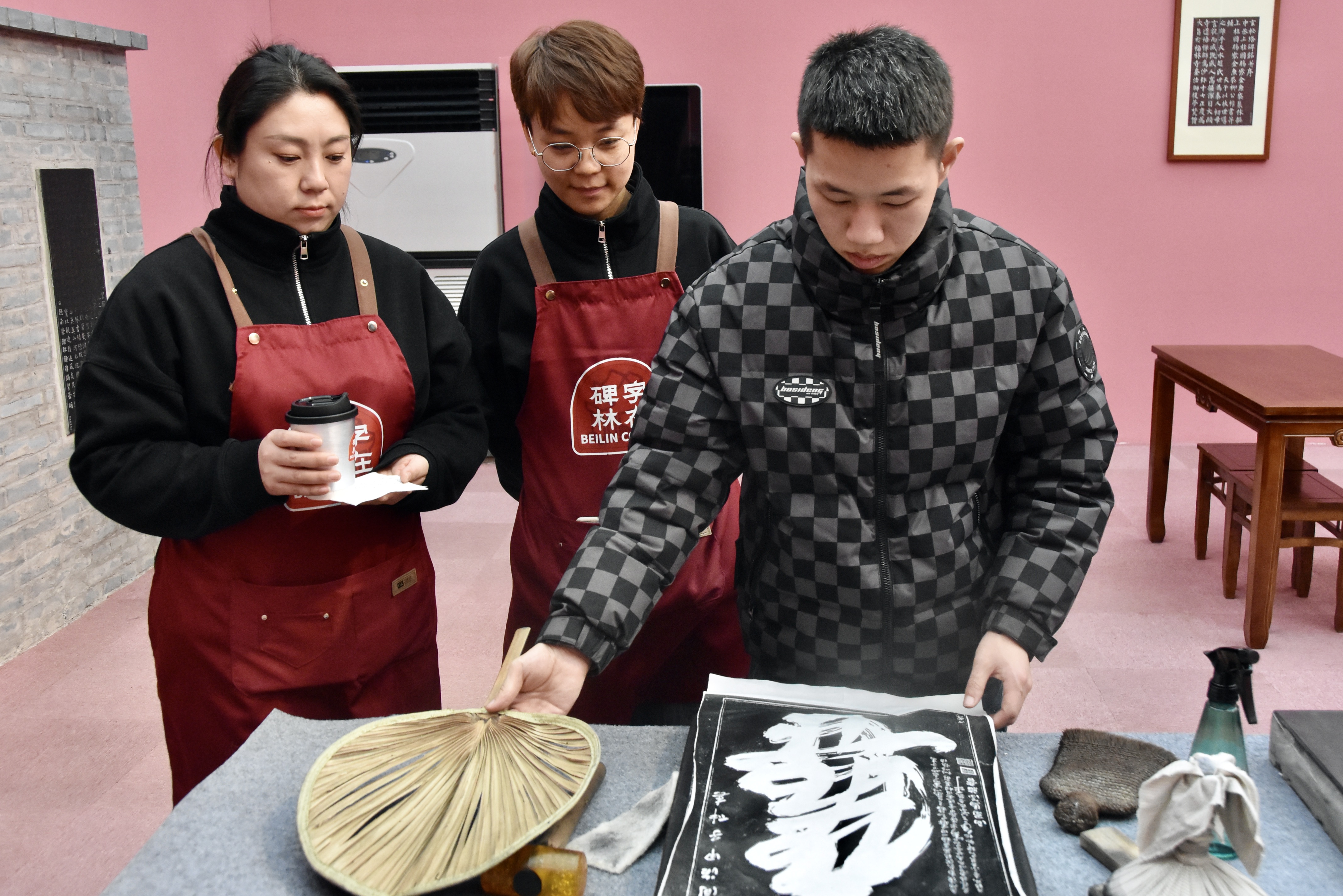 12月1日,在西安碑林博物館內(nèi)的咖啡店,聽障咖啡師席玉萍(左)、高夢(中)在觀看拓印師制作碑刻拓片。新華社記者 鄭昕 攝