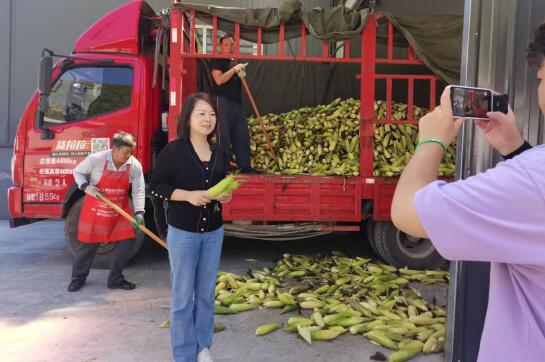 王琪與工作人員抬玉米