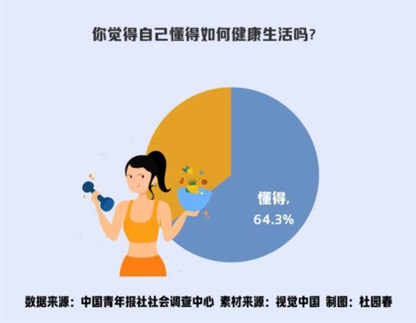 調查顯示,64.3%的受訪青年認為自己懂健康生活,35.7%的受訪青年表示“不懂”。進一步分析顯示,受訪青年所在城市級別越高,認為自己懂健康生活的比例越高,一線城市受訪青年的比例最高,為71.6%;上班族認為自己懂健康生活的比例(65.8%)略高于在校大學生(64.6%);隨著年齡的增長,受訪青年認為自己懂健康生活的比例越高,受訪85后最高,為67.2%,00后相對最低,為61.2%。