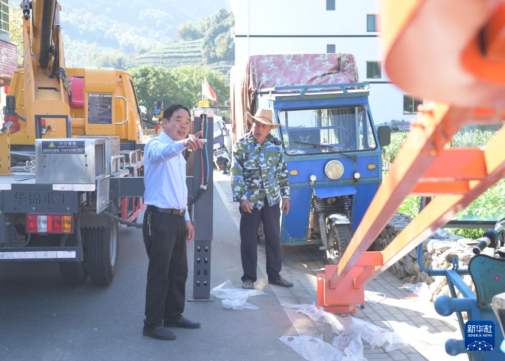 福鼎市赤溪村黨總支書(shū)記吳貽國(guó)(左)指導(dǎo)路燈安裝工作(2023年12月8日攝)。新華社記者 林善傳 攝