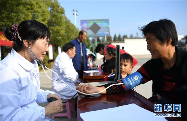 11月4日,安徽醫(yī)科大學(xué)第一附屬醫(yī)院的醫(yī)生為村民體檢。 當(dāng)日,安徽省肥西縣豐樂鎮(zhèn)邀請(qǐng)安徽醫(yī)科大學(xué)第一附屬醫(yī)院的醫(yī)生來到鄉(xiāng)村,免費(fèi)為周邊村民提供醫(yī)療咨詢、健康體檢、醫(yī)療保健等衛(wèi)生服務(wù)。新華社記者劉軍喜攝 11月4日,安徽醫(yī)科大學(xué)第一附屬醫(yī)院的醫(yī)生為村……